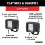 ARIES LED lights are made to shine bright, last long and take a beating. Each light boasts grade-A LED chips, an IP68-standard breather, waterproof aluminum construction, a 50,000+ hour lifespan and a pedigree of thorough testing and certifications. At the heart of each ARIES LED light is a set of grade-A LED chips. Each LED is set into a high-efficiency reflector to eliminate as much wasted light as possible and allowing for 96% reflector efficiency. This means a farther-reaching, more powerful beam without increased electrical input or higher running temperatures. The LED chips are securely mounted in a strong, rust-free aluminum housing and shielded with a rugged Lexan lens to withstand impacts and resist cracking. The housing keeps moisture out and allows us to give our LED lights an IP68 and IP69K waterproof and dustproof rating. Each light is also equipped with an IP68-standard breather that completely seals the housing and keeps moisture and air from getting inside and corroding the LEDs. ARIES LED lights are outfitted with dual, oversize heat sinks for optimal efficiency and longevity. These heat sinks keep running temperatures low, protect against burnout and promote a long operating life. Our lights average a 50,000-hour lifespan, translating to five years of continuous use. They also feature instant on-off, so no time is wasted waiting for the light to warm up. To prove that our LED lights are different, they undergo strenuous testing, including a UV test, extreme temperature test, vibration test, dust test, salt test and altitude test. They are CE-certified and RoHS-certified. Each light comes with stainless steel mounting hardware and pivoting bracket for custom positioning on your vehicle, and each is fitted with a strong, waterproof wiring harness for a reliable connection.