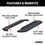 Powerful, definitive and uncompromising as a mountain ridge, ARIES RidgeStep running boards are made for the truck owner who gets it done, day after day. With their solid, all-steel construction, non-skid treads and tough powder coat finish, RidgeStep running boards are made to finish the job. Installation of these running boards is easy and secure because they use the ARIES VersaTrac mounting system. The underside of each board is equipped with a channel that accepts a set of heavy-duty bracket inserts. The inserts move along the channel to fit your vehicle, and the mounting hardware provides a secure attachment. The boards are made in four base lengths, including 53", 75", 85" and 91", and they are designed for vehicle-specific application (NOTE: VersaTrac mounting brackets are sold separately; see the application information to determine which brackets and boards fit your vehicle). ARIES RidgeStep running boards are not only made for easier installation, but they are also built to face the harsh elements of the commercial job. They feature high-strength, solid steel construction for a step that can keep up with those steel-toe boots, and they are completely without plastic parts, meaning they will not crack or fade over time. Their stamped, all-steel tread offers a 6-1/2" wide, non-skid surface that will never wear down no matter how many times you climb in and out of your truck. The end caps are also made from steel and are welded to contour to the body of your vehicle for a professional finish. RidgeStep running boards come with a unique E-coat and textured black powder coat finish to not only withstand rust but also to hide minor scratches and grime. From the cattle ranch of the arid desert plains to the forgotten forest trails of the frozen tundra, the job doesn't wait for those who lag behind. Rise to the challenge and master the job with ARIES RidgeStep running boards.