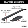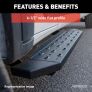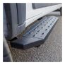 Powerful, definitive and uncompromising as a mountain ridge, ARIES RidgeStep running boards are made for those who gets it done, day after day. With their solid, all-steel construction, non-skid treads and tough powder coat finish, RidgeStep running boards are made to finish the job. Installation of these running boards is easy and secure because they use the ARIES VersaTrac mounting system. The underside of each board is equipped with a channel that accepts a set of heavy-duty bracket inserts. The inserts move along the channel to fit your vehicle, and the mounting hardware provides a secure attachment. The boards are made in four base lengths, including 53", 75", 85" and 91", and they are designed for vehicle-specific application (NOTE: VersaTrac mounting brackets are sold separately; see the application information to determine which brackets and boards fit your vehicle). ARIES RidgeStep running boards are not only made for easier installation, but they are also built to face the harsh elements of the commercial job. They feature high-strength, solid steel construction for a step that can keep up with those steel-toe boots, and they are completely without plastic parts, meaning they will not crack or fade over time. Their stamped, all-steel tread offers a 6-1/2" wide, non-skid surface that will never wear down no matter how many times you climb in and out of your vehicle. The end caps are also made from steel and are welded to contour to the body of your vehicle for a professional finish. RidgeStep running boards come with a unique E-coat and textured black powder coat finish to not only withstand rust but also to hide minor scratches and grime.