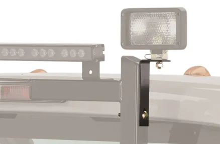 Sport Light Bracket places light at cab height beside each upright tube, bolts to existing holes in upright, and uses the same holes in upright as other brackets. Each upright can only accommodate one bracket of any kind. 7/16-inch hole on horizontal flatbar to mount stud mounted lights. Includes one pair of L Brackets and fasteners and is suitable for Backrack only.