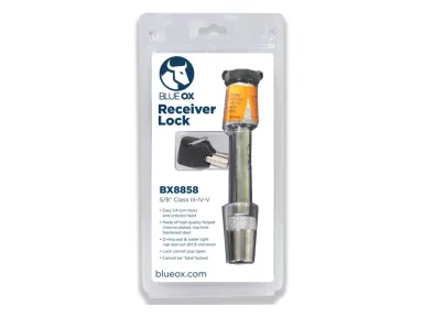 Secure your Blue Ox tow bar to your RVs hitch with a 5/8 in. diameter receiver lock. Receiver lock secures motor-home-mounted tow bar to RVs trailer hitch receiver.