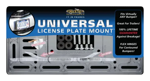 This is your solution to 'nontraditional' license plate mounting hole spacing (traditional spacing is 7 in.), flexible hinge for any angled/curve bumper.