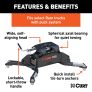 Like the other 5th wheel hitches of the CURT Q-series, the CURT Q20 is designed to offer the quietest 5th wheel towing possible. It does this using a spherical axial bearing. This unique pivoting mechanism is built into the hitch head and allows it to tilt with the 5th wheel trailer in any direction necessary. With its dual-locking jaws for 360-degree pin contact and three grease fittings for continuous lubrication, the spherical axial bearing provides smooth, safe, quiet towing, even with large 5th wheel trailers. The Q20 also makes the coupling process easier. It features a self-aligning head to help reduce errors when backing up to the kingpin, as well as a three-position coupling indicator that is visible from the truck cab, eliminating the need to get out of the vehicle to check the connection. This 20K 5th wheel hitch comes with a weight capacity of 20,000 lbs. and is finished with a durable carbide black powder coat for an excellent defense against rust, scratches and UV damage. This particular Q20 hitch comes with a set of CURT OEM puck system 5th wheel legs, designed to be mounted on a Ram long-bed pickup with the truck bed puck system. Using a set of quarter-turn anchors, the legs quickly and easily drop into the pucks, instantly mounting the Q20 hitch and equipping the truck for 5th wheel towing. The anchors feature an adjustable design to perfectly lock the hitch into place and eliminate any chucking noises, and the legs are finished in a durable carbide black powder coat to be highly resistant to scratches, rust and UV damage. These legs are only intended to fit the Ram puck system and cannot be installed without it. Certain turret-style pin boxes, such as Sidewinder, are not compatible with CURT Q-series hitches and should not be used as they may create vehicle / trailer handling hazards. Please contact CURT Product Support for compatibility information.