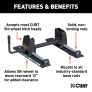 A CURT 5th wheel trailer hitch is the ultimate combination of towing power and smooth driving, but a CURT 5th wheel mounted on a 5th wheel roller turns this gentle giant into the ultimate in mobility too. If you have a short-bed truck, it can be difficult towing a large RV trailer, especially one with an extended front overhang. When you are towing a 5th wheel with a 6-foot truck bed, give yourself a little breathing room with a CURT 5th wheel roller. Our 5th wheel rollers mount easily onto a set of 5th wheel rails or a gooseneck adapter already installed in the bed of your pickup truck. CURT 5th wheel rollers feature solid construction and offer a sturdy mounting place for your 5th wheel hitch, ensuring that none of its towing strength is lost. CURT 5th wheel rollers are also true rolling units, meaning they actually roll on wheels that bear the weight of the trailer rather than simply moving on hollow rods as seen in competitive models. With a thick operating handle, the roller smoothly rolls the 5th wheel head forward and back, locking securely into each position as desired. CURT rollers also provide up to 12" of displacement as well, unlike the more common 10", to give you a wide range of motion and plenty of space to get your RV or other 5th wheel trailer around any turn. This 24K 5th wheel roller comes with a durable carbide powder coat to ensure the best possibly protection against scratching, chipping, rusting and UV damage. It has a towing capacity of 24,000 lbs. and is compatible with select CURT 5th wheel hitches and some competitive 5th wheel hitches.