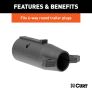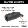 There are several different types of connectors used to supply power from a tow vehicle's electrical system to a trailer's wiring system. Some trailers only need the bare essentials -- running lights, brake lights and turn signals -- while others require a connection for reverse lights, electric brakes and auxiliary power. With connectors ranging from simple to complex, it may be the case that the connection between your vehicle and your trailer is not a perfect match. For example, your truck may be equipped with a 6-way round socket, but your trailer may have a 4-way flat plug. For this very common problem, CURT offers a quick and simple solution in the form of an electrical adapter. An adapter is an electrical device that allows a connection to be made between a mismatched trailer plug and vehicle socket. It easily plugs in your vehicle's electrical socket and usually requires no additional wiring. CURT offers an array of adapters to accommodate most types of plugs and sockets, including 4-way flat, 4-way round, 5-way flat, 6-way round, 7-way RV blades and more. This electrical adapter is designed to adapt a 7-way RV blade vehicle socket to fit a 6-way round trailer plug (center pin for auxiliary power). It features quality plastic construction and requires no splicing. All CURT wiring and electrical products come with a one-year limited warranty to give you the assurance you need to tow with confidence.