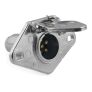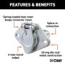 Like trailer hitches and ball mounts, electrical connectors range all over the board in shape, size and capability, but no matter what your trailer's electrical functions are, you need a solid connection to keep the power flowing and ensure safety on the road. CURT electrical connectors are designed and manufactured to give you a reliable connection every time you plug in your trailer. This 6-way round connector is designed to supply power for tail lights, turn signals, electric trailer brakes, a 12-volt battery and brake lights, as well as a ground connection. It features durable die-cast metal construction and comes with a spring-loaded steel cover to resist damage from dust and water. This 6-way round connector is a female-end socket, specifically designed for the vehicle side of the connection. 6-way round connectors are commonly used on livestock trailers, boat trailers and utility trailers.