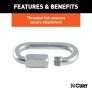 CURT quick links are an extremely versatile and reliable tool to help you get to your destination and go a little further once you get there. A quick link is essentially a hook that is able to be fastened into a closed loop. This means it can be linked onto any D-ring or tie-down like a hook and just as easily secured like a seamless link in a chain. CURT quick links feature a special threaded end and barrel screw that allow them to be dependable and convenient. The threaded link requires no tools for tightening or loosening, though it does feature a hex shape that can accept a wrench for an extra tight hold. Quick link hooks can be used to connect rope, cable and chain, and they are the perfect safety accessory to maximize the security of your safety chains and trailer. Their list of possible applications also goes well beyond towing, giving you a reliable connection for rock climbing, boating, camping, setting up a swing or hammock, leashing the dog, repairing chain, fastening down cargo and more. To make sure our quick links are fit to face the outdoors and all of your undertakings, we construct them from heat-treated steel and give them a zinc-plated finish for durability and rust resistance. This CURT quick link features a breaking strength of 11,000 lbs., a working load limit of 2,200 lbs. and features a 3/8" diameter link.