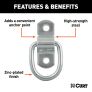 Making sure that your cargo is tied down and fully secure for the journey is important for any towing job. Not only is unsecured cargo a danger to you, your passengers and your fellow drivers, but it can also cause damage to your trailer, pickup truck bed or vehicle cargo area, as well as to the cargo itself. Together with our cargo straps and safety chains, CURT tiedown anchors are easy to mount in any trailer, truck or full-size van, and they help keep your items safe for the road ahead. This particular D-ring tiedown anchor is designed to be surface mounted and add a convenient anchoring point for cargo straps, ropes or cables. It comes with a 2-1/4" x 13/16" mounting bracket and two 1/4" diameter mounting holes, spaced 1-1/2" apart, center to center. This rope ring features zinc-plated steel construction and offers a working load capacity of 1,200 lbs. (2,400 lbs. break strength). Mounting screws are not included in this package.