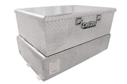 Dee Zee Combo Tanks - The convenience of a utility chest connected to a liquid transfer tank. Constructed of heavy duty .125 Brite-Tread aluminum. Radius curve design eliminates key weld pressure points. Aluminum is durable light weight and eliminates the worry of rust. Tanks feature stability baffles, 3/8 in. drainage plug. Tool box offers lockable storage with high quality stainless steel paddle handles and features gas shocks. Tanks are intended for private use (non-commercial). Not designed for use as an auxiliary fuel system. Not designed for use as an auxiliary fuel system. Does not meet title 49 of the United Stated Federal Registry governing transportation.