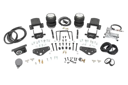Ideal Leveling: Is your truck your workhorse? The main attraction of a pickup is the ability to haul and tow as needed. However, due to the weight in the bed or the condition of the rear leaf springs, your vehicle may become un-level under load. At Rough Country, we've designed a solution to eliminate these concerns. Introducing Rough Country's Rear Air Spring Kit. Heavy-Duty Construction: Rough Country's Rear Air Spring Kit includes two high-quality, double convoluted air bags, reinforced with durable powder-coated steel brackets and DOT-approved airlines. Whether you're towing a trailer or hauling heavy loads, this kit helps ensure your vehicle remains level, alleviating the strain on your trailer's tongue weight. The kit features 1/4" push-to-connect air fittings for easy installation, along with all necessary bracketry for a secure fit. Rough Country's Air Spring Kit supports up to 5,000 lbs. of load, minimizing sway and preventing bottoming out while braking and steering. Easy Installation: Quick and simple setup for immediate use. Rough Country's kit can be installed at home with standard tools in just 5-6 hours, ensuring minimal downtime and fast, hassle-free installation. Onboard Air Compressor and Wireless Controller: For added convenience, Rough Country offers an optional onboard air compressor and wireless controller to easily adjust your air spring kit on the go. Control air pressure at the push of a button from the comfort of your vehicle. Reliable Warranty Coverage: Rough Country's Rear Air Spring Kit includes a limited lifetime warranty on the air springs and a two-year replacement warranty on the compressor, offering lasting protection against manufacturer defects. This industry-leading coverage ensures confidence in both quality and durability, so you can count on Rough Country to keep your truck performing at its best.
