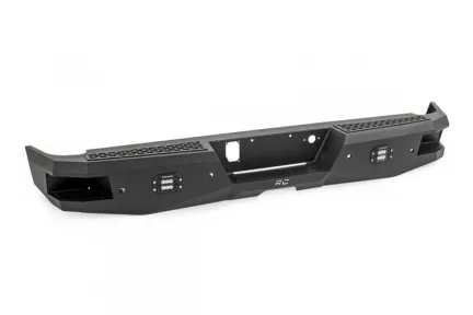 Give the rear of your truck an aggressive, new appearance with Rough Country's Rear LED Bumper. This easy-to-install upgrade gives your truck an improved look and better functionality. Each bumper features two Rough Country Black-Series 2in LED Flush Mount Cubes for rear illumination, and two integrated steps for easy access to the bed. Rough Country's Rear LED Bumper is made of a durable, all-steel construction that s ready to handle whatever you dish out. Each bumper also includes sensor relocators to allow you to retain the vehicle's anti-collision system. Unlike some aftermarket bumpers for this model, Rough Country's LED Rear Bumper allows you to retain the factory receiver hitch for towing. Complete the look with Rough Country's Front LED Bumper for a total transformation of your truck. Includes a 3-year Warranty!