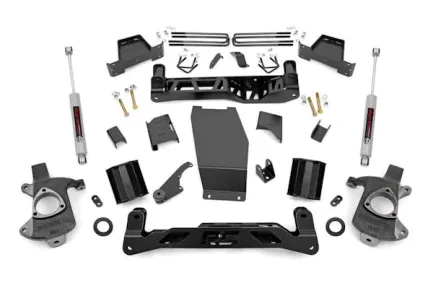 Get the look you really want with Rough Country's 7-inch Suspension Kit for 4WD '14+ Chevy / GMC 1500 Pickups. This massive kit affords your truck the ability to run 35-inch tires on factory wheels with our beefy lifted knuckles and is designed with 100% laser-cut materials for the best possible fit on your vehicle.Includes a set of front and rear high-clearance cross members featuring the RC logo and a differential skid-plate. Each kit also comes with a set of durable, fabricated anti-wrap lift blocks that offer a huge boost while helping prevent axle wrap issues.Give your pickup an aggressive, lifted and level stance with incredible ride quality! Our innovative Lifted Knuckle design boosts ride height while keeping all components at the optimum angles for a factory-like ride. This kit includes a set of rear N3 Shocks, balanced for on and off-road use. I