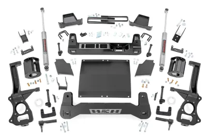 Explore New Heights: Chevy's fourth generation 1500 features an impressive all-new design that's built from the ground up, with aggressive angles and head-turning stylings that fit in beautifully when transformed with Rough Country's 6-inch Suspension Lift. Innovative Design and Construction: When changing a vehicle's suspension, the key to preserving ride quality is keeping the geometry of all suspension components as close to their factory angles as possible. This suspension kit combines the use of durable steel knuckles, differential brackets, and drop cross members to reduce cv angles and simulate factory angles all while achieving new heights. Featuring a set of upper strut spacers that offer uncompromised strength and rigidity, gaining lift height is no issue. Completing the rear of this suspension kit is a set of rear blocks, shocks, and U-bolts that allow you to retain factory-like geometry. This combined setup provides enough clearance to run 35" tires without additional modifications. We didn't want to limit you to one standard kit. Rough Country's 6-inch kit is configurable with all the shock options that we offer. This allows you to choose which shock series you want! Ranging from our nitrogen-charged N3 shocks to our Vertex reservoir shocks the power to choose is in your hands. Installation: With minor cutting and a strut compressor required to install, an estimated timeframe of 8-10 hours is recommended to complete this full installation. This full kit can be installed at home and can be completed efficiently and quickly! Limited Lifetime Replacement Warranty: Rough Country's 6" Suspension Lift Kit is backed with a limited lifetime replacement warranty towards manufacturer defects. As such, the product is protected from structural and workmanship damage after the date of purchase. With our industry-leading warranty give yourself peace of mind when using Rough Country's Suspension products!