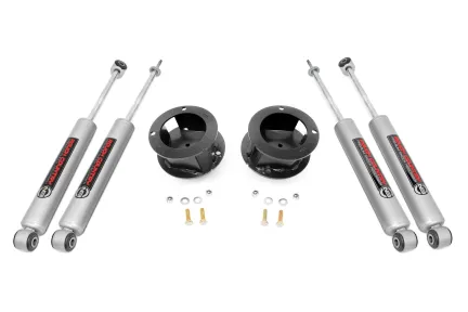 Lift, level, and smooth out your ride with Rough Country's new and improved 2.5-inch RAM 2500/3500 Leveling Kit. Engineered to fit RAM trucks equipped with front radius arm suspension setups, this easy-to-install kit gives a big boost at an unbelievable price! Rough Country's durable coil spring spacers have been expertly redesigned to match the factory geometry of your truck, including the angle of the coil mounts and position of the rubber isolator, which perfectly indexes both springs to eliminate any chance of coil bowing. This kit also includes a pair of front N3 Shock Absorbers for better ride quality both on and off-road. Rough Country's N3 shocks are nitrogen charged, featuring 10-Stage Velocity Sensitive Valving for a smooth ride no matter what the terrain. This kit also features a lightning fast, 100% bolt-on installation process that couldn't be easier or less invasive to your new vehicle. Includes Rough Country's Lifetime Replacement Warranty.