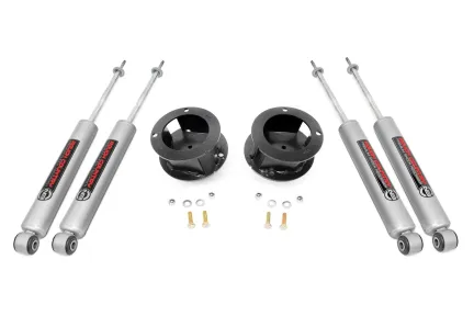 Lift, level, and smooth out your ride with Rough Country's new and improved 2.5-inch RAM 2500/3500 Leveling Kit. Engineered to fit RAM trucks equipped with front radius arm suspension setups, this easy-to-install kit gives a big boost at an unbelievable price! Rough Country's durable coil spring spacers have been expertly redesigned to match the factory geometry of your truck, including the angle of the coil mounts and position of the rubber isolator, which perfectly indexes both springs to eliminate any chance of coil bowing. This kit also includes a pair of front N3 Shock Absorbers for better ride quality both on and off-road. Rough Country's N3 shocks are nitrogen charged, featuring 10-Stage Velocity Sensitive Valving for a smooth ride no matter what the terrain. This kit also features a lightning fast, 100% bolt-on installation process that couldn't be easier or less invasive to your new vehicle. Includes Rough Country's Lifetime Replacement Warranty.