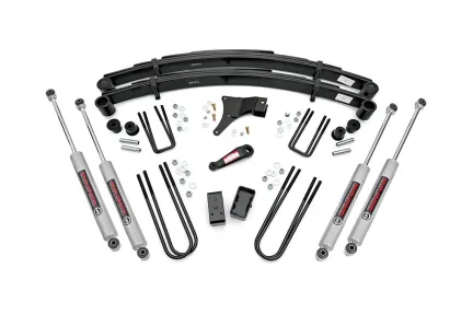 Give your 86-97 Ford F-350 an impressive upgrade, front to back with Rough Country's 4" Ford Suspension Lift Kit! This easy-to-install lift kit raises the front of your vehicle to be equal height with the rear for a leveled, better-than-stock look that gives an improved ride height and more aggressive appearance. This kit features a set of front, lifted leaf springs allowing you gain additional ride height without sacrificing ride quality or performance. A pitman arm and track bar bracket are provided to keep everything at optimum angles for a factory-like ride, even after lifting. A set of Rough Country's premium N3 shocks are also included. These fine tuned 10-stage variable high-pressure Nitrogen charged shocks offer a fantastic blend of off-road action and smooth highway ride quality. With a durable 18mm spring-loaded piston rod and faster-cooling 54mm shock body. Get the wheels you want! Rough Country's 4" Ford Suspension Lift Kit comes with everything you need to fit up to a 35" tire with proper wheel backspacing. Best of all, Rough Country's 4" Ford Suspension Lift Kit is backed by our Lifetime Replacement Warranty.