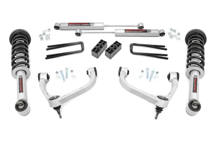 Upgrade your truck with an unbeatable combination of aggressive good looks, increased ground clearance, and premium components - all at an incredible value. Designed specifically for thirteenth-generation F-150 models, this kit delivers a hassle-free installation and enhanced performance both on and off the road. Premium Forged Aluminum Control Arms for Maximum Durability: This kit includes high-quality forged aluminum upper control arms, engineered for superior strength and easier alignment adjustments. Built with heavy-duty rubber bushings, these arms ensure long-lasting reliability while maintaining factory-like geometry. By keeping ball joints at optimum angles, they reduce stress and wear, giving your suspension an extended lifespan. Fully Configurable with All Shock/Strut Options: Customize your ride with the perfect suspension setup! Choose from nitrogen-charged N3 shocks for a balanced ride or upgrade to premium Vertex reservoir shocks for maximum performance and adjustability. Whether you're looking for comfort, off-road capability, or high-end damping control, this kit gives you full flexibility to dial in your ride quality. Balanced Stance with Increased Ground Clearance: This 3-inch lift kit levels the front and rear of your truck, eliminating factory rake and giving your F-150 a clean, aggressive stance.