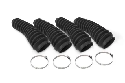 Rough Country's high-quality Shock Boots are the best solution for protecting your shocks from dirt, dust, mud and other contaminants. Made of a high-quality polyurethane, each boot is designed to hold up to the elements and resist fading for a long life of good looks and protection. Forget zip ties and other cheap methods of securing your boots. Rough Country Shock Boots feature a premium stainless steel boot clamp for a secure, precise fit that looks far better than cheaper alternatives. Rough Country's (4) Black Shock Boots w/ Clamps - 87164