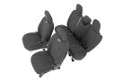 Want to protect your seats or are your seats showing signs of wear and tear from daily use? Say goodbye to unsightly stains and deterioration with Rough Country's Neoprene Seat Covers - the ultimate solution for preserving your vehicle's interior. Snug Fit for Optimal Protection: Our seat covers are tailored to fit your seats perfectly, providing a protective barrier against spills, scratches, and everyday wear and tear. Factory-Spec Construction: Engineered to meet factory specifications, our covers blend seamlessly with your vehicle's interior, giving it a fresh, new look without compromising on quality or style. Four-Layer Defense: With a four-layer construction featuring foam padding and a durable polyester shell, our seat covers offer unmatched protection and longevity, ensuring your seats stay looking new for years to come. Breathable and Water-Resistant: The neoprene layer not only provides breathability for added comfort but also boasts water-resistant properties, safeguarding your seats from spills and stains. Complete Coverage: Our covers come with full protection for your front seats, including headrest covers where applicable, as well as rear covers to shield your back seats from children and pet-related mishaps. Peace of Mind Warranty: Rest easy knowing your purchase is backed by our two-year warranty, giving you confidence in the durability and reliability of our product. Don't let worn-out seats diminish your driving experience. Upgrade to Neoprene Seat Covers today and enjoy a fresh, stylish interior that's protected against the rigors of daily life on the road.