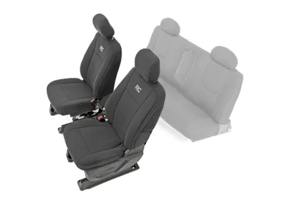 Want to protect your seats or are your seats showing signs of wear and tear from daily use? Say goodbye to unsightly stains and deterioration with Rough Country's Neoprene Seat Covers - the ultimate solution for preserving your vehicle's interior. Snug Fit for Optimal Protection: Our seat covers are tailored to fit your seats perfectly, providing a protective barrier against spills, scratches, and everyday wear and tear. Factory-Spec Construction: Engineered to meet factory specifications, our covers blend seamlessly with your vehicle's interior, giving it a fresh, new look without compromising on quality or style. Four-Layer Defense: With a four-layer construction featuring foam padding and a durable polyester shell, our seat covers offer unmatched protection and longevity, ensuring your seats stay looking new for years to come. Breathable and Water-Resistant: The neoprene layer not only provides breathability for added comfort but also boasts water-resistant properties, safeguarding your seats from spills and stains. Complete Coverage: Our covers come with full protection for your front seats, including headrest covers where applicable, as well as rear covers to shield your back seats from children and pet-related mishaps. Peace of Mind Warranty: Rest easy knowing your purchase is backed by our two-year warranty, giving you confidence in the durability and reliability of our product. Don't let worn-out seats diminish your driving experience. Upgrade to Neoprene Seat Covers today and enjoy a fresh, stylish interior that's protected against the rigors of daily life on the road.