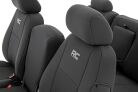 Want to protect your seats or are your seats showing signs of wear and tear from daily use? Say goodbye to unsightly stains and deterioration with Rough Country's Neoprene Seat Covers - the ultimate solution for preserving your vehicle's interior. Snug Fit for Optimal Protection: Our seat covers are tailored to fit your seats perfectly, providing a protective barrier against spills, scratches, and everyday wear and tear. Factory-Spec Construction: Engineered to meet factory specifications, our covers blend seamlessly with your vehicle's interior, giving it a fresh, new look without compromising on quality or style. Four-Layer Defense: With a four-layer construction featuring foam padding and a durable polyester shell, our seat covers offer unmatched protection and longevity, ensuring your seats stay looking new for years to come. Breathable and Water-Resistant: The neoprene layer not only provides breathability for added comfort but also boasts water-resistant properties, safeguarding your seats from spills and stains. Complete Coverage: Our covers come with full protection for your front seats, including headrest covers where applicable, as well as rear covers to shield your back seats from children and pet-related mishaps. Peace of Mind Warranty: Rest easy knowing your purchase is backed by our two-year warranty, giving you confidence in the durability and reliability of our product. Don't let worn-out seats diminish your driving experience. Upgrade to Neoprene Seat Covers today and enjoy a fresh, stylish interior that's protected against the rigors of daily life on the road.
