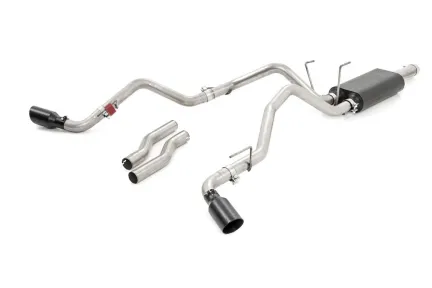 Give your truck an aggressive, throaty growl and killer good looks with Rough Country's Dual Cat-Back Exhaust System for Dodge Ram 1500 models. These durable exhaust systems are fine tuned to improve air flow and deliver and the perfect aftermarket exhaust note that will put a smile on your face every time you hit the gas. Each kit features a set of high-temp resistant, dual-wall 304 black stainless tips with RC logo for an improved, aggressive look. Upgrading your exhaust note has never been easier! Each kit conveniently installs onto the factory hangers and features stainless clamps for easy assembly with no welding required! Transform your truck today and let your engine ROAR with the best Dodge Ram 1500 exhaust kit money can buy!