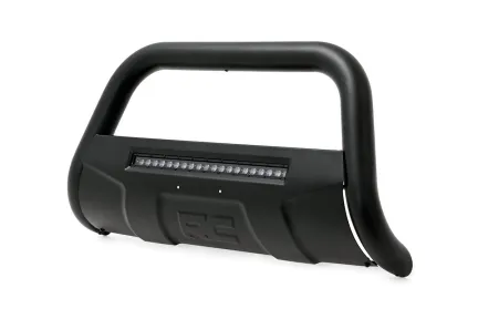 COMMAND THE DARK with Rough Country's new LED Bull Bar! This durable 3-inch thick tubular steel bull bar provides unbeatable protection for the front side of your vehicle, with an integrated Rough Country 20-inch Black-Series Single-Row LED Light bar to provide ample lighting for the trail ahead. This easy-to-install bull bar features a 100% bolt-on installation process, giving you a simple way to add this eye-catching upgrade that provides protection from hazards on and off-road. Each LED Bull Bar includes a removable license plate relocation bracket and corrosion-resistant black powder coat to ensure a long-lifespan for years to come. Rough Country's Single-Row 20-inch Black-Series LED light bar features Cree LEDs outputting a staggering 7200 Lumens and 90 watts of lighting power. Rough Country's all-weather LED lights feature a durable, die-cast aluminum housing and include a premium, waterproof, flat-wound, braided wiring harness with toggle switch and in-line fuse.