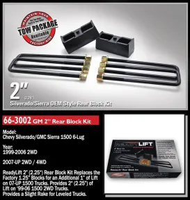 ReadyLIFT OEM-style rear block kits are available for model specific applications. These Rear Block Kits include two (2) 2.25" Rear Blocks, four (4) E-Coated U-Bolts, eight (8) Nuts and Washers and will safely lift the rear of your truck an additional 1" to 3" depending on the application. Based on OEM designs and never made out of light weight extrusions our 2.25" GM Blocks are made from cast iron and have anti-rotation ears built-in. Fits 1999-2021 classic and current body style 6-lug model GM trucks. 2007-2018 2WD and 4WD trucks with OEM 1.25" blocks will want to take advantage of the additional 1" of lift for towing and hauling, particularly when using a front leveling kit. This block is 2.25" which, when removing the factory 1.25" block, results in 1" of increased rear lift. 1999-2006 2WD trucks [which have no rear block] will to take advantage of 2.25" lift using the 66-3002 ReadyLIFT Rear Block Kit. This kit eliminates the dangers of having to stack blocks which may be illegal in some states. ReadyLIFT Block Kits will put a slight rake back in your truck for hauling or towing and are designed to work in concert with your ReadyLIFT Suspension Leveling Kit. Like all ReadyLIFT products these block kits come with our Lifetime Warranty. Every ReadyLIFT Rear Block Kit comes complete with one pair of OEM- quality e-coated cast iron rear blocks, model and size-specific U-bolts, hardware and instructions. Note: 2019-UP trucks may need to trim off excess bolt length after installation. Note: Not for use on 2019-2022 GM 1500 trucks with the composite rear overload. Note: This GM 1500 kit is NOT COMPATIBLE with vehicles equipped with rear composite mono-leaf springs. The mono-leaf is easily identifiable the U-bolt is round/circular around the top of the leaf spring. This kit only works with vehicle equipped with traditional steel leaf springs identified by square U-bolts.