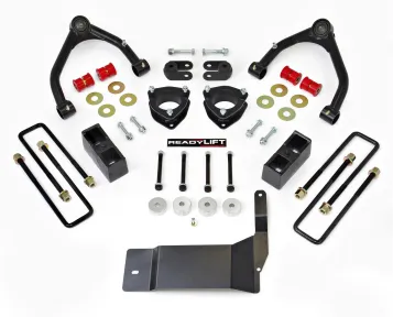 New - now includes ultra strong TCT free floating pivot bushings that are self lubricating and eliminates friction. ReadyLIFT 69-3414 4" SST Lift Kit is designed for the 2014-2018 GM 1500 4WD & Z71 trucks. ReadyLIFT 69-3414 4" SST Lift Kit combines many of the great features of our time-tested and very popular 4" SST Lift Kit for the 2007-2013 trucks with new innovative features. Some features implemented into this system include a completely different differential drop mounting system which utilizes machined billet circular spacers which allows for just the right amount of differential drop without interfering with the rear-mounted electric steering rack. A rugged skid plate accompanies our differential drop system. Our 4" SST Lift Kit uses the heavy duty ball joint found on the GM 2500 HD series trucks -- these ball joints are vastly superior and are already installed into the tubular steel upper Control Arms provided in the kit. This kit also includes premium TCT UCA inner bushings and new washer backing spacer sleeves which greatly prolong the life of the bushings. Our engineering testing has shown this 4" SST Lift Kit is extremely versatile and strong allowing the customer to install up to a 33X11.50 tire (max) on 5.25" backspacing wheel. The kit is for use on trucks with the factory Aluminum or stamped steel upper and lower Control Arms. Not for use on trucks with cast steel upper Control Arms. Z71 standard suspension okay. NOTE: The ReadyLIFT 69-3414 SST Lift Kit is designed for use with Aftermarket Wheels with a backspacing of 5.25". If you intend to run the stock wheels with an aftermarket larger tire, a wheel spacer is required to prevent the tire from touching the control arm at full-locked turn. ReadyLIFT has developed a CNC-machined billet Aluminum wheel spacer 10-3485 for use with factory wheels. To run the OE/Factory wheels AND tires, you will need to use the ReadyLIFT 1/2" Billet Wheel Spacers. Note: Use of Auto 4 Hi feature not recommended.