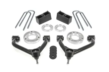 ReadyLIFT customers have asked for it and we have delivered. Last fall we announced our new leveling and SST lift kit offerings for the all-new GM 1500 trucks. We specifically did not include the factory lift kit-equipped GMC AT4 and Chevy Silverado Trail Boss. The AT4/Trail Boss are factory equipped with a 2" front lift. This front lift includes a longer front shock/strut assembly. When combining a traditional leveling kit on these factory lifted trucks, several issues present themselves including binding problems with the factory control arm ball joint and contact concerns with the lower strut/CV axle assembly.