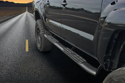 Durable 4" oval tubing, custom mounting brackets, aggressive polypropylene step pads & OE style bends. Available in Black Texture Matte, T304 polished stainless steel, & T304 polished stainless steel with stainless brackets