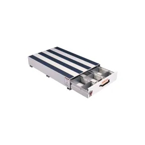 - Steel roll-out drawer has a 425 lb load rating evenly distributed 14-gauge steel top and sides allows 750 lbs load rating evenly distributed 12-gauge steel skids extra strength Anti-skid strips provide traction for work boots One-Touch latch assembly provides easy, one-hand operation Roll-out drawer for easy access and organization Includes 3 compartments with 18 dividers Each drawer compartment measures 5 in high, 9-3/4 in wide, 45 in long Brite White ARMOR-TUF Powder Coat finish ensures years of dependability Limited lifetime warranty ensures unparalleled quality